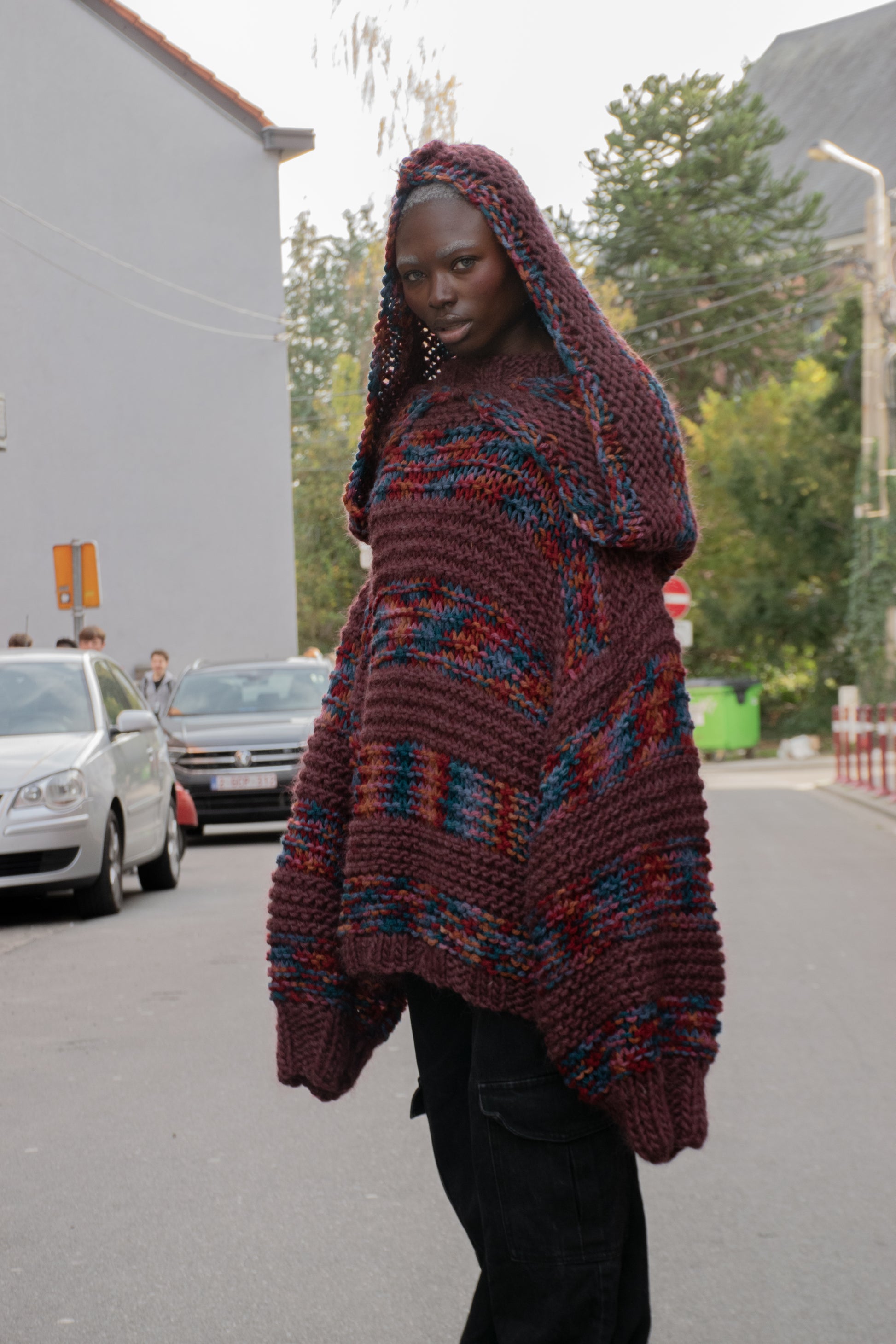 Sa coupe oversize structurée, combinée à une capuche XXL intégrée, crée une silhouette moderne et protectrice, presque architecturale. Les tons profonds de bordeaux, mêlés de nuances multicolores, donnent au pull un caractère brut et organique, faisant de chaque pièce une création unique.